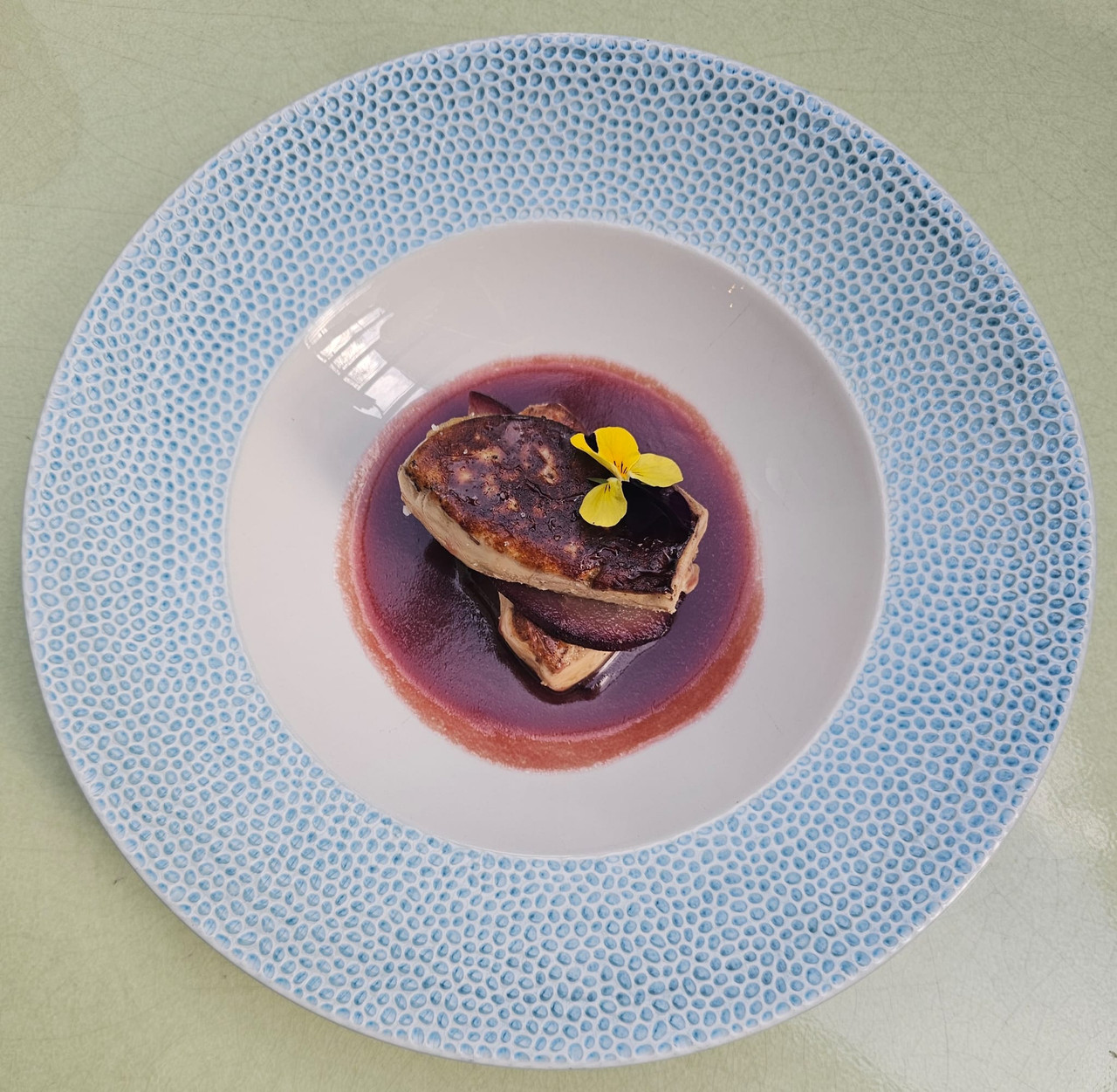 Escalopes de Foie Gras Poêlé, Poire Pochée, et Jus Réduit au Confit d'Abricot